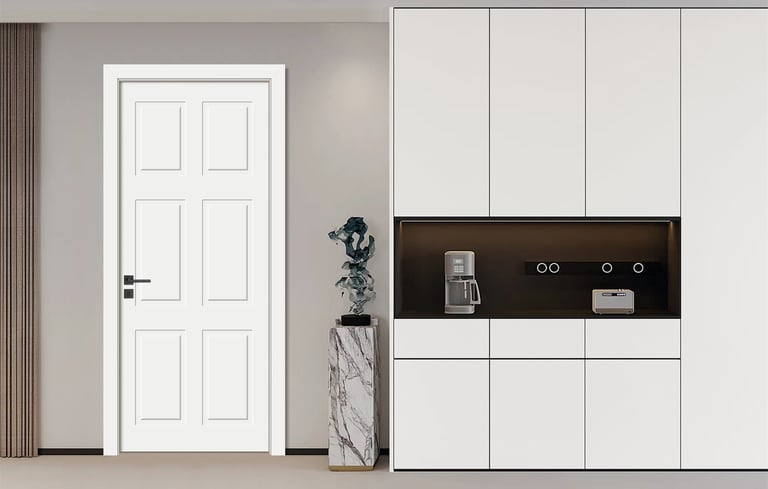 This 6-panel lacquered door features a refined composition with two smaller upper panels and four elongated lower panels, creating a balanced vertical rhythm that visually enhances the height of the space. The premium lacquer finish provides excellent resistance to scratches, yellowing, and daily wear, ensuring long-lasting beauty and easy care.
