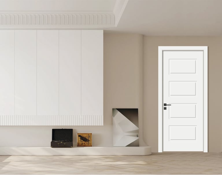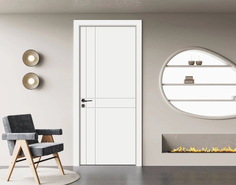 This door features a series of evenly spaced diagonal grooves that create a sense of motion across the surface. The design is subtle yet expressive—bringing rhythm and continuity to modern interiors. Finished in smooth lacquer and paired with matte black hardware, it offers a clean, contemporary look that complements minimalist architecture.