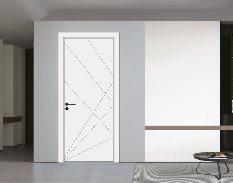This PVC-wrapped door is defined by a strategic composition of two lines: a vertical groove on the left and a horizontal stroke through the center. Their intersection creates an invisible axis, bringing architectural poise and geometric harmony to the minimalist surface.