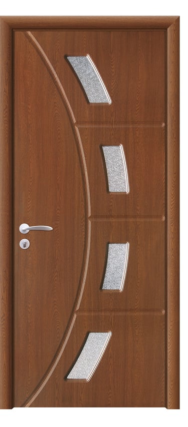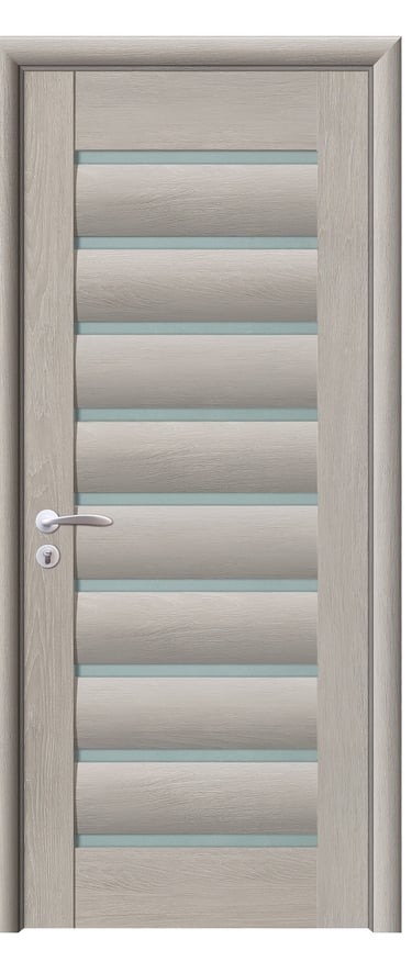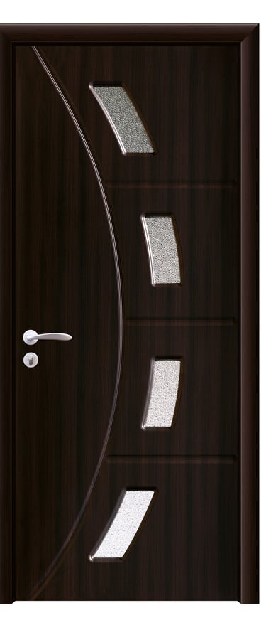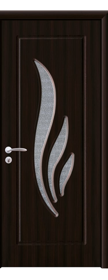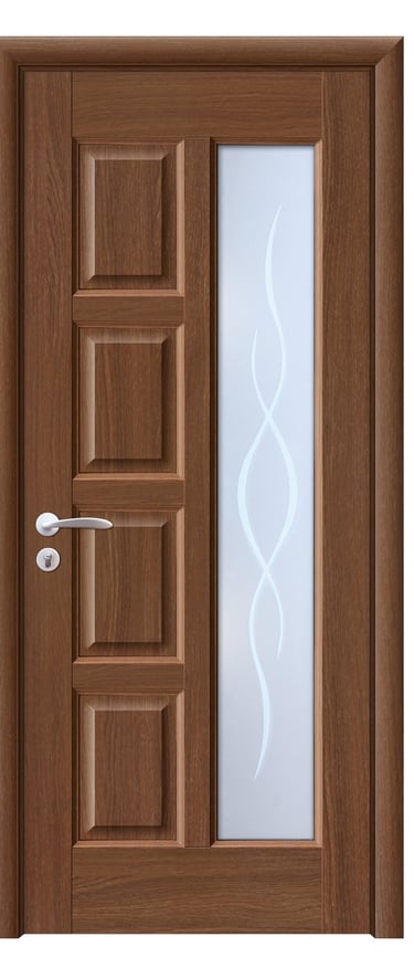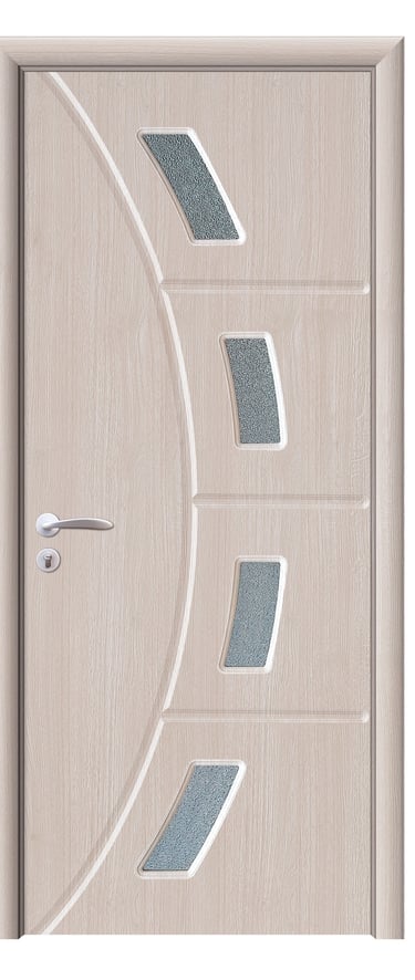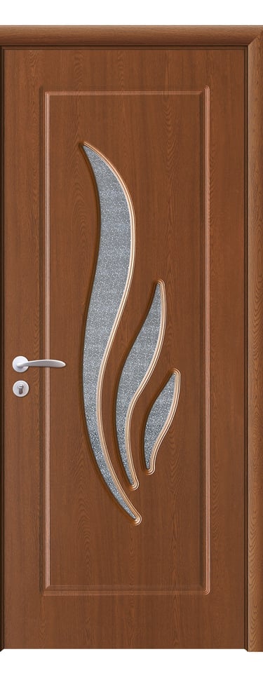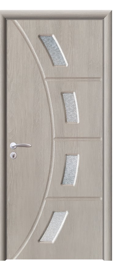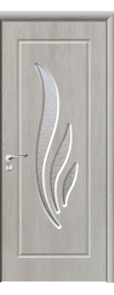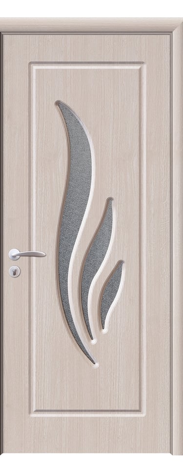 This PVC door features a graceful arc design with four feather-shaped diamond-textured glass inserts flowing along its curve. A slim decorative line runs beside the glass, enhancing visual continuity and adding dynamic elegance. A solid version without glass is also available, preserving the sculptural silhouette with a quieter presence. Made from high-quality PVC, the door is moisture-resistant, scratch-proof, and easy to maintain—ideal for bedrooms, living rooms, studies, and office interiors. Available in multiple woodgrain finishes: Grey Oak (modern clarity), Dark Oak (warm depth), Silver Oak (fresh brightness), and Black Walnut (refined prestige). Custom colors are also supported to match diverse interior schemes. This model strikes a perfect balance between artistic form and functional durability, making it a refined choice for spaces that value fluidity and detail.