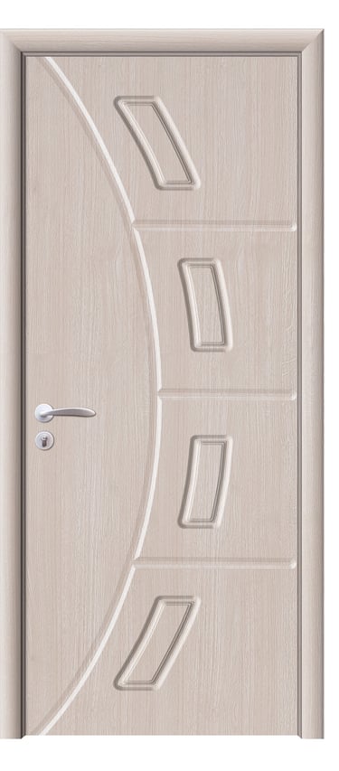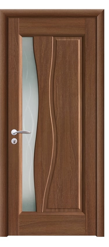 This assembled PVC door showcases a graceful silhouette with a frosted glass panel on the left, framed by a soft, sweeping curve that adds elegance and motion. The glass ensures privacy while introducing gentle light into the space; a solid version without glass is also available for a more subdued look. Crafted with precision assembly, the door features clean lines and stable structure. The PVC surface is moisture-resistant, scratch-proof, and easy to maintain—ideal for bedrooms, studies, living rooms, and office interiors. Available in a range of woodgrain finishes: Grey Oak (modern clarity), Golden Teak (natural warmth), Black Rose (noble mystery), and Alice Pearl White (pure brightness), with custom colors offered to match diverse design schemes. This model balances aesthetic refinement with functional durability, making it a perfect choice for interiors that value subtle detail and spatial harmony.