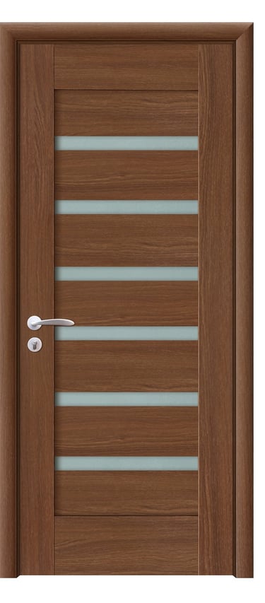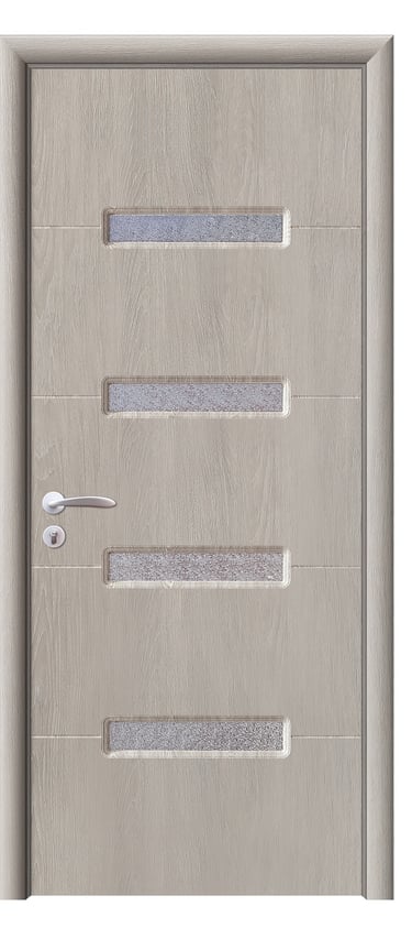 Featuring four evenly spaced horizontal diamond-textured glass inserts, this model creates a bright, disciplined rhythm; a solid, no-glass option retains layering with reduced translucency. PVC ensures moisture resistance, scratch protection, and easy cleaning—ideal for living rooms, kitchens, corridors, and meeting spaces. Available in nine finishes: Grey Oak, Dark Oak, Silver Oak, Black Walnut, SABBIA, VECCIO, Golden Teak, Black Rose, and Alice Pearl White. Guidance: choose Silver Oak/SABBIA/Pearl White to introduce light; opt for Dark Oak/Black Walnut/Black Rose for privacy and gravitas; select Grey Oak/VECCIO for minimal elegance; Golden Teak for natural comfort. Glass texture (frosted, diamond), diffusion level, hardware color, and handle styles are customizable to match design intent. This model balances light and structure, ensuring openness with a defined boundary.