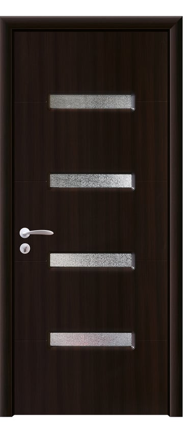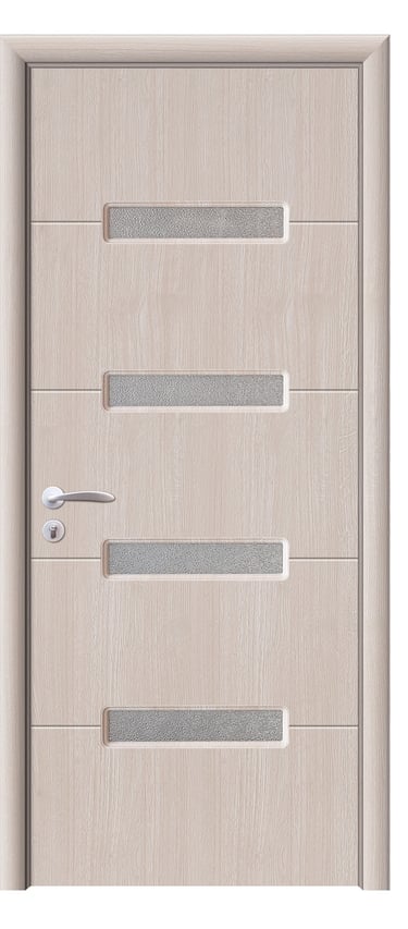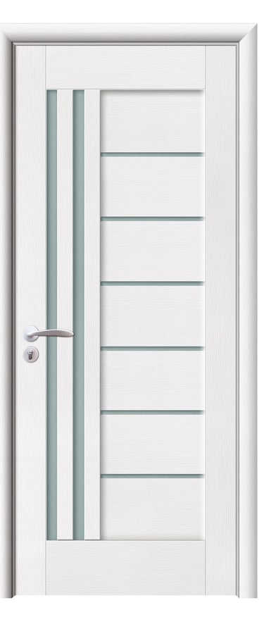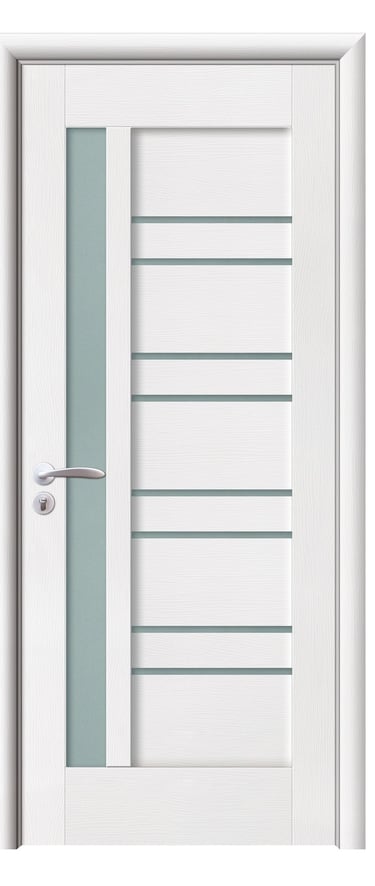 This assembled PVC door features a sleek composition of alternating horizontal frosted glass and wood panels, creating a rhythmic, contemporary aesthetic. The frosted glass ensures privacy while allowing soft light to filter through, making it ideal for living rooms, kitchens, studies, and office interiors. Crafted with precision assembly, the door offers clean lines and structural stability. Its PVC surface is moisture-resistant, scratch-proof, and easy to maintain. Available in multiple woodgrain finishes: Grey Oak (modern clarity), Golden Teak (natural warmth), Black Rose (noble mystery), and Embossed White (pure dimensionality). The Embossed White paired with black glass delivers striking contrast and refined elegance—perfect for spaces seeking a bold, luxurious statement. Custom colors and hardware options are also available to match diverse interior schemes. This model balances light, structure, and material performance, making it a standout choice for modern residential and professional environments.