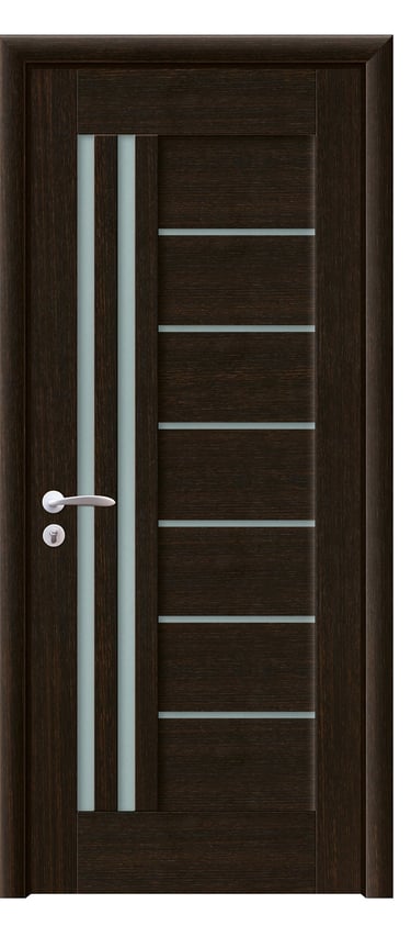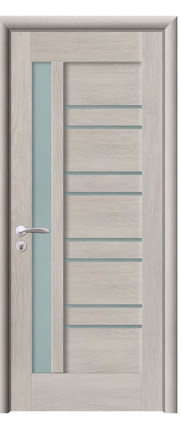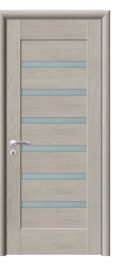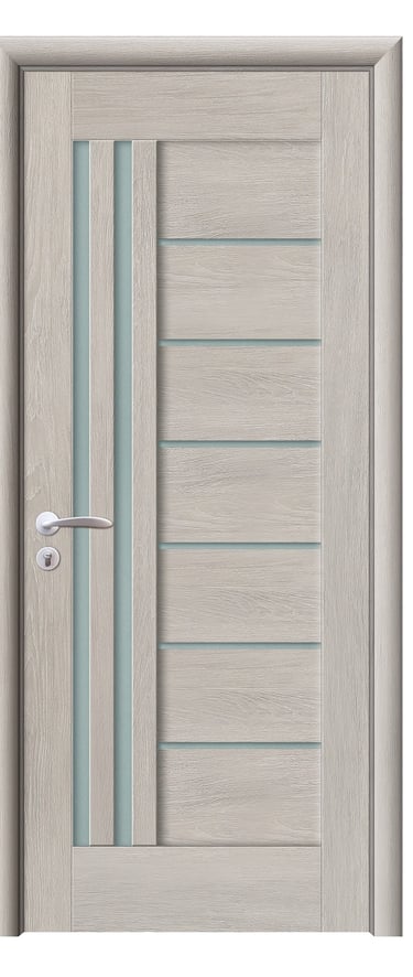 This assembled PVC door expresses modern spatial rhythm through geometric clarity and soft light diffusion. One side features seven horizontal wood panels alternating with six slim frosted glass strips, creating a stable and rhythmic composition. The opposite side integrates two vertical matte glass inserts, forming a luminous focal point with vertical emphasis. The design balances horizontal structure with vertical elegance, offering both aesthetic appeal and functional performance. Made from high-quality PVC, the door is moisture-resistant, scratch-proof, and easy to maintain—ideal for bedrooms, studies, living rooms, and office interiors. Available in a range of woodgrain finishes: Grey Oak (modern clarity), Golden Teak (natural warmth), Black Rose (elegant mystery), and Alice Pearl White (pure brightness), with custom colors and hardware options available to suit diverse interior styles. This model achieves harmony between light, structure, and material—perfect for contemporary spaces that value refined detail and durable design.
