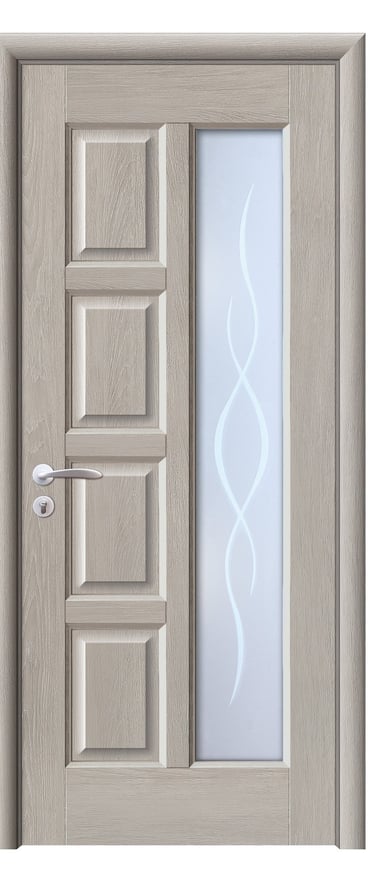 This assembled PVC door blends geometric structure with graceful curves, creating a refined and layered visual presence. A frosted glass panel on the right features two intertwined lines, offering privacy while introducing soft light. On the left, four vertical wood segments form a balanced, clean composition that enhances structural clarity. Crafted with precision assembly, the door is made of high-quality PVC—moisture-resistant, scratch-proof, and easy to maintain—ideal for bedrooms, studies, living rooms, and office interiors. Available in a range of woodgrain finishes: Grey Oak (modern clarity), Golden Teak (natural warmth), Black Rose (elegant mystery), and Alice Pearl White (pure brightness), with custom colors and hardware options available to suit diverse interior styles. This model achieves harmony between light, structure, and material, making it a perfect choice for spaces that value artistic detail and functional elegance.