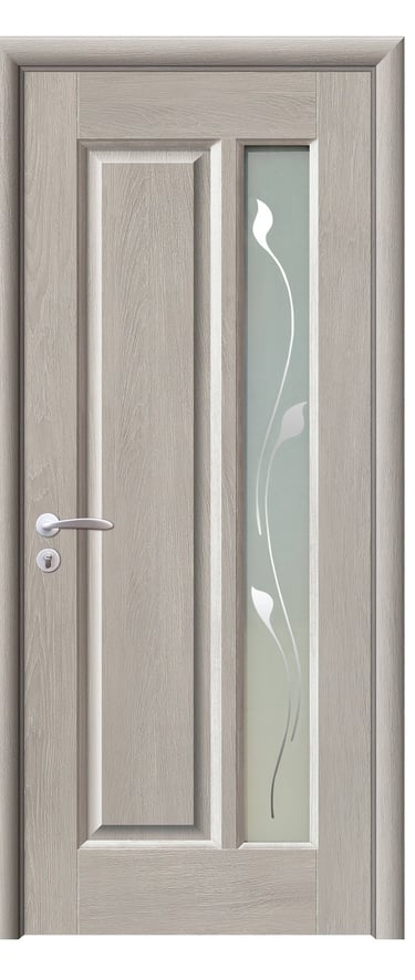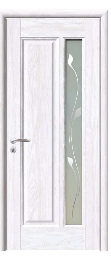 This assembled PVC door showcases refined proportions and elegant detailing. A frosted glass panel on the right features a mirrored floral motif, adding a touch of artistry and light play to the design. On the left, a clean rectangular panel enhances structural clarity and balance. The overall composition blends geometric precision with soft curves, offering both decorative appeal and functional performance. Made from high-quality PVC, the door is moisture-resistant, scratch-proof, and easy to maintain—ideal for bedrooms, studies, living rooms, and office interiors. Available in multiple woodgrain finishes: Grey Oak (modern clarity), Golden Teak (natural warmth), Black Rose (elegant mystery), and Alice Pearl White (pure brightness). The Pearl White paired with mirrored floral glass delivers a luxurious, luminous effect. Custom colors and hardware options are also available to suit diverse interior styles. This model achieves harmony between light, structure, and material—perfect for spaces that value artistic detail and refined ambiance.
