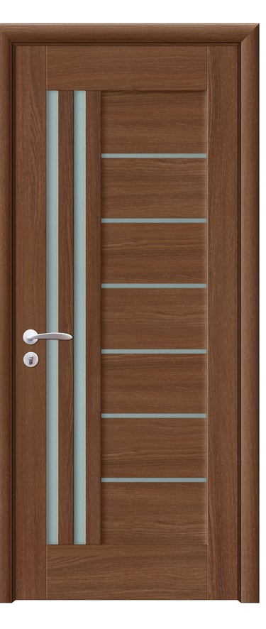 This assembled PVC door presents a stately and elegant composition, blending geometric order with refined light diffusion. One side features five horizontal wood panels interspersed with eight slim frosted glass strips, punctuated by four smaller wood segments that add layered rhythm and visual depth. The opposite side integrates a single vertical matte glass insert, creating a soft, luminous focal point with vertical emphasis. Every proportion is carefully balanced, with clean lines and a harmonious structure. Made from high-quality PVC, the door is moisture-resistant, scratch-proof, and easy to maintain—ideal for bedrooms, studies, living rooms, and office interiors. Available in a range of woodgrain finishes: Grey Oak (modern clarity), Golden Teak (natural warmth), Black Rose (elegant mystery), and Alice Pearl White (pure brightness), with custom colors and hardware options available to suit diverse interior styles. This model achieves a perfect balance between architectural rhythm and light detail—an ideal choice for contemporary spaces that value elegance and functionality.
