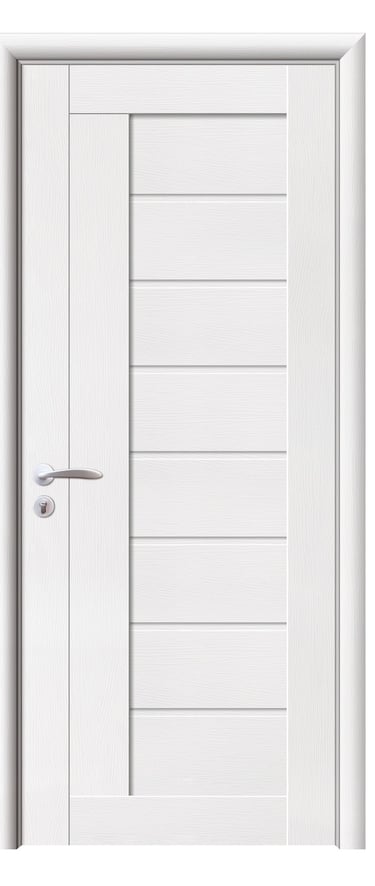 This assembled PVC door delivers a restrained, modern aesthetic through geometric clarity. The façade is composed of eight horizontal panels to create a calm, stable rhythm, paired with a single vertical panel on one side as a structural divider and visual anchor—clean proportions with a refined horizontal–vertical dialogue. The glass-free design enhances privacy and unity, making it ideal for bedrooms, studies, corridors, and meeting rooms. Precision assembly ensures crisp edges and reliable structure, while PVC offers moisture resistance, scratch protection, and easy maintenance for long-term stability. Available in multiple woodgrain finishes: Grey Oak (modern clarity), Golden Teak (natural warmth), Black Rose (elegant mystery), and Alice Pearl White (pure brightness). Custom colors and hardware options are also supported to align with diverse interior schemes. Balancing disciplined form with durable performance, this model is a strong choice for spaces that value simplicity, order, and texture.