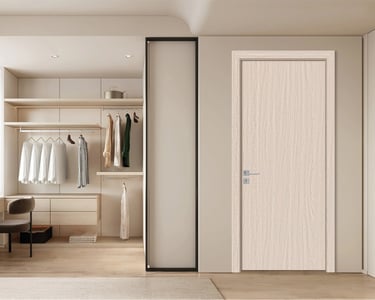 Finished with high-quality PVC wrap, the surfaces are waterproof, stain-resistant, scratch-proof, and easy to maintain—blending minimalist aesthetics with everyday resilience. Available in both matte solid tones for quiet sophistication and glossy finishes for contemporary reflection, these doors integrate seamlessly into varied interior styles. More than doors, they are extensions of spatial atmosphere—offering a rational yet warm expression of minimalist living for those who value restraint, order, and inner harmony.